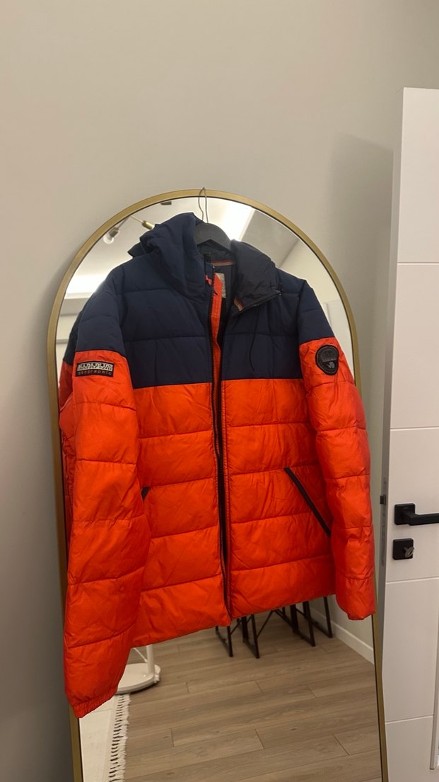 Fermuarlı ve dar kesim erkek kapitone monttur. Koyu mavi ve canlı turuncu renkleri uzun kollu ve çentikli yaka ile buluşturur, dış mekan için uygundur.