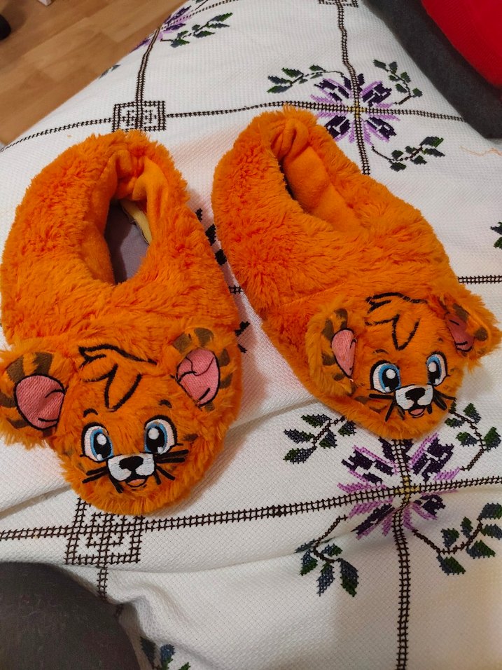 Turuncu, leopar desenli ve kürk detaylı kız çocuk peluş terlik. Yumuşak ve sıcak tutan malzemeden yapılmıştır. panduf numarası yok fakat 33 34 numara gibi ölçüsü var