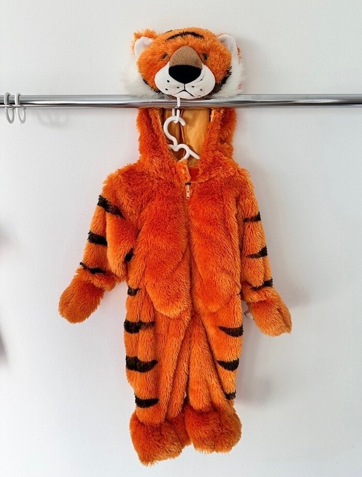 Turuncu leopar desenli, yumuşak kürklü sokak tarzı kedi kıyafeti, kapüşonunda kaplan yüzü detaylıdır. 1 kez giyildi 3-4 yaş