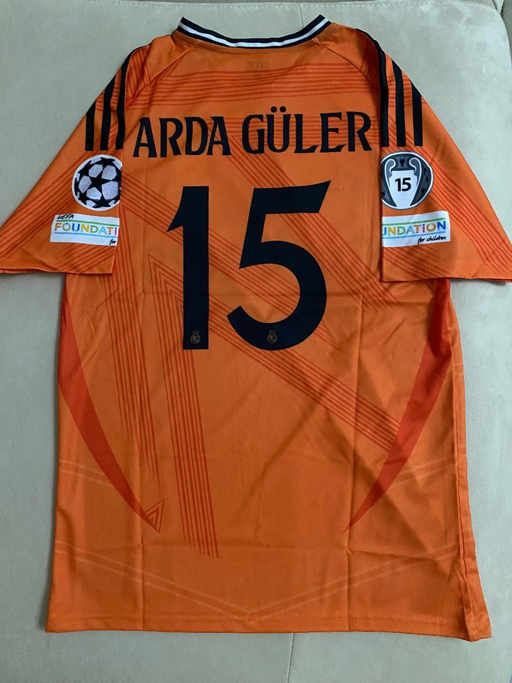 Parlak turuncu sentetik kumaştan, kısa kollu ve bisiklet yakalı erkek spor forması. Bol kesim, normal midi boy ve Velcro detaylı, üzerinde Arda Güler ismi ve 15 numara baskılı. TERLEME YAPMAZ A KALİTEDİR