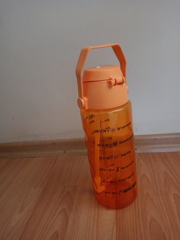 Turuncu renkli, ölçü işaretli, kilitli kapaklı ve saplı matara
