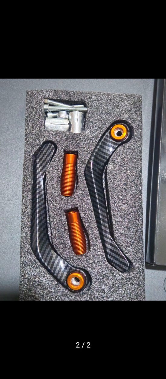 Turuncu ve gri metal motosiklet dizlikleri, tokalı tasarım ve yılan derisi desenine sahip, avant-garde tarzda.