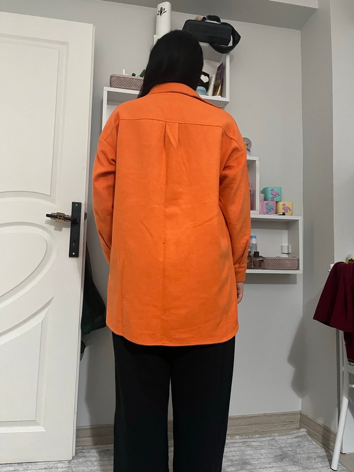 Turuncu renk, midi boy, bol kesim oduncu ceketi. Uzun kollu, yaka detaylı, yumuşak ve sıcak dokulu kumaştan günlük kullanıma uygun.
