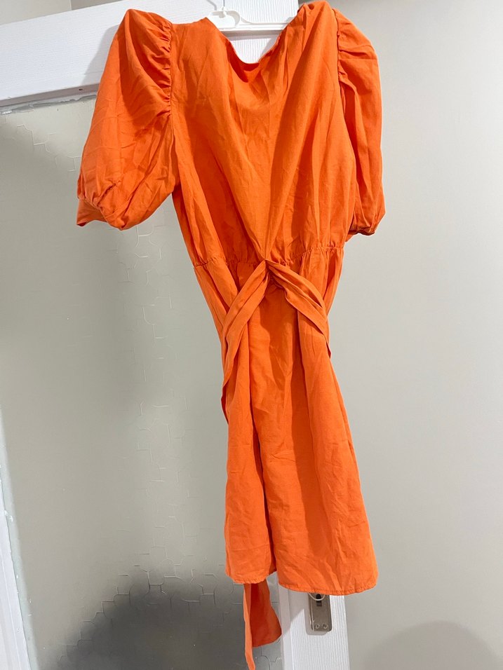 Turuncu midi keten elbise, kısa balon kollu, halter yakalı ve bol kesimdir. Belde bağlama detayı ve drapeli tasarımıyla günlük sokak stiline uygundur.