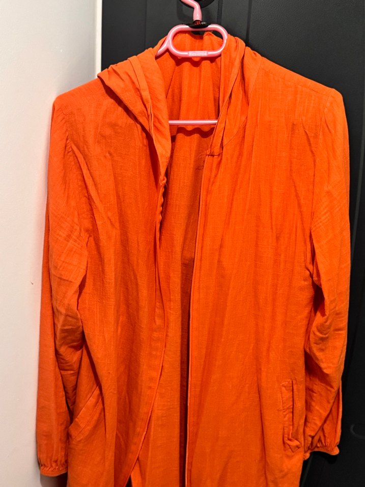 Kadınlar için keten kumaştan, bol kesim, uzun kollu, kesik yakalı ve parlak turuncu renkte midi uzunlukta yağmurluk. Streetwear tarzına uygun.az kullanıldı şapkalı cepli
