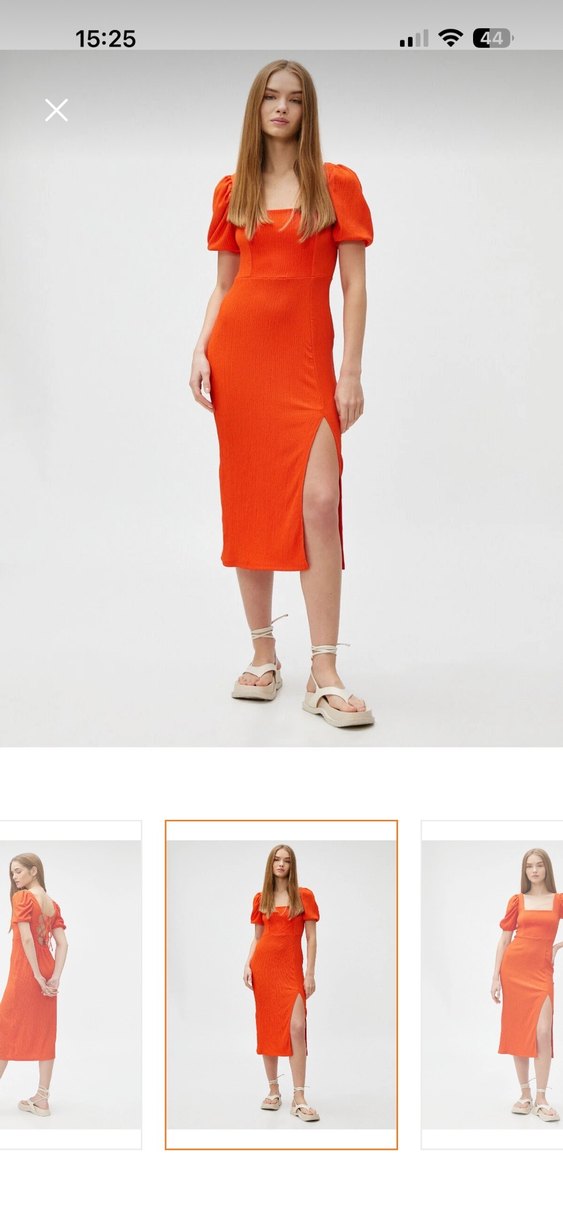 Turuncu renkte, ince askılı ve tek renk midi elbise. Tekne yakalı, vücuda oturan kesimiyle romantik akşamlar için şık ve rahat bir seçim.