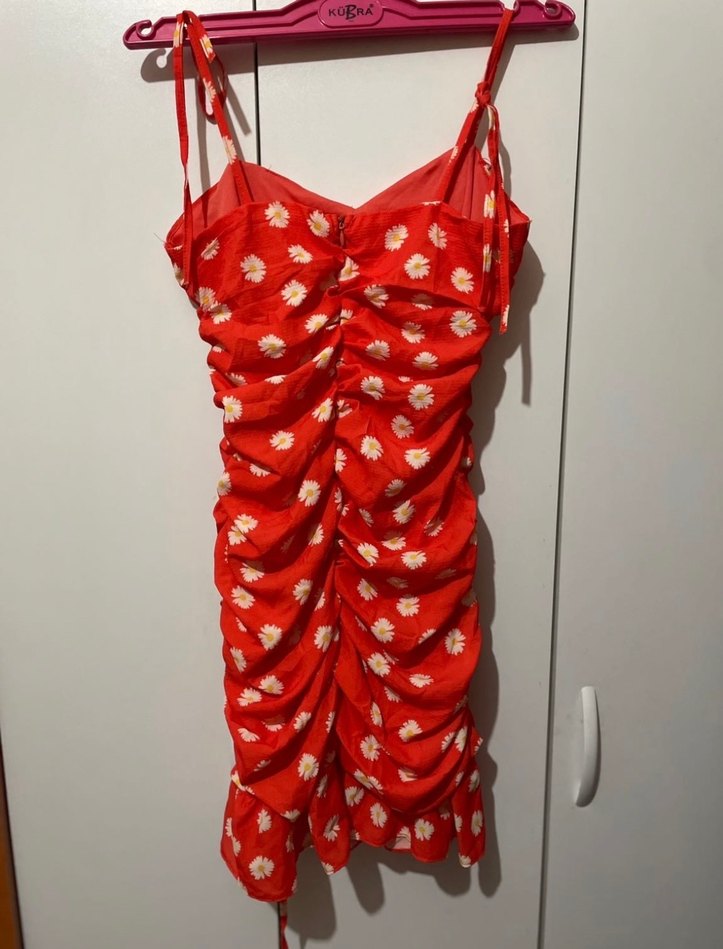 Drapeli, askılı kısa ve fitted kesim elbise. Canlı turumcu sentetik kumaş, renkli tie-dye desenli, bohem Paris havasında romantik akşamlar için uygun.