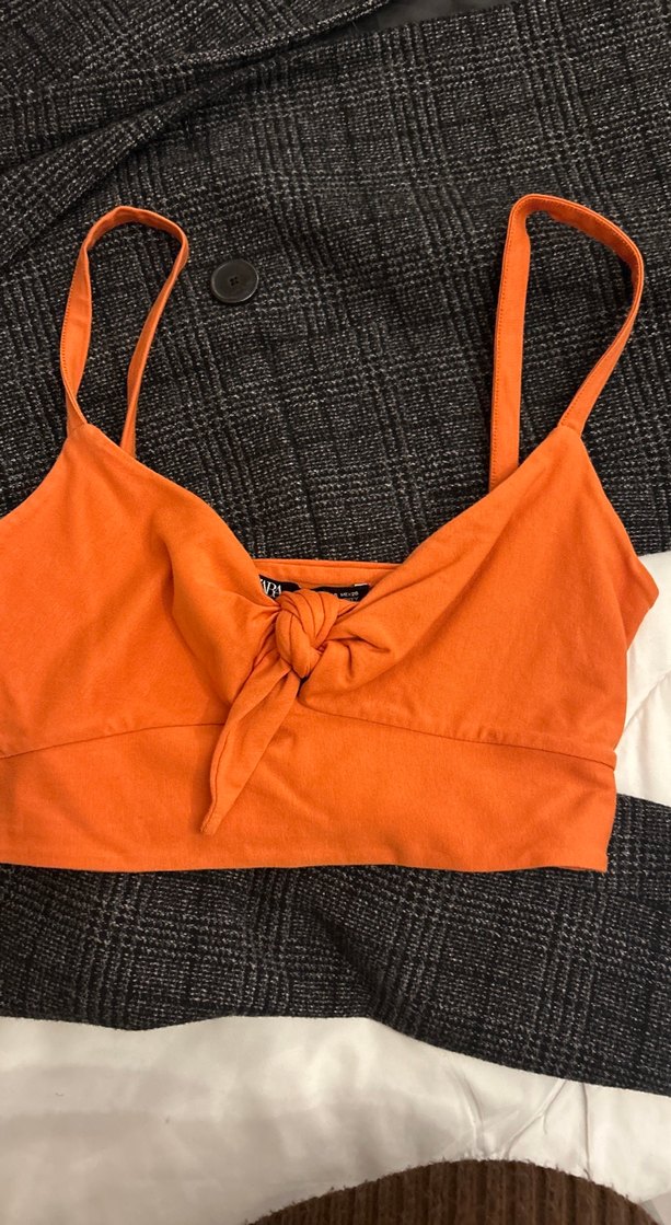 İnce askılı ve önünde düğüm detayı bulunan turuncu mini bralet, athleisure ve streetwear tarzları için uygundur.