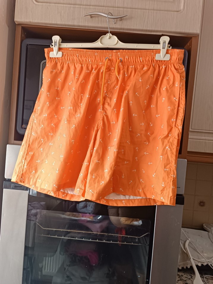 Parlak turuncu renkte, kemerli ve bol kesim erkek mini deniz şortu. Plaj ve günlük rahat sokak giyimine uygun, ince desenli ve konforlu uzunlukta.