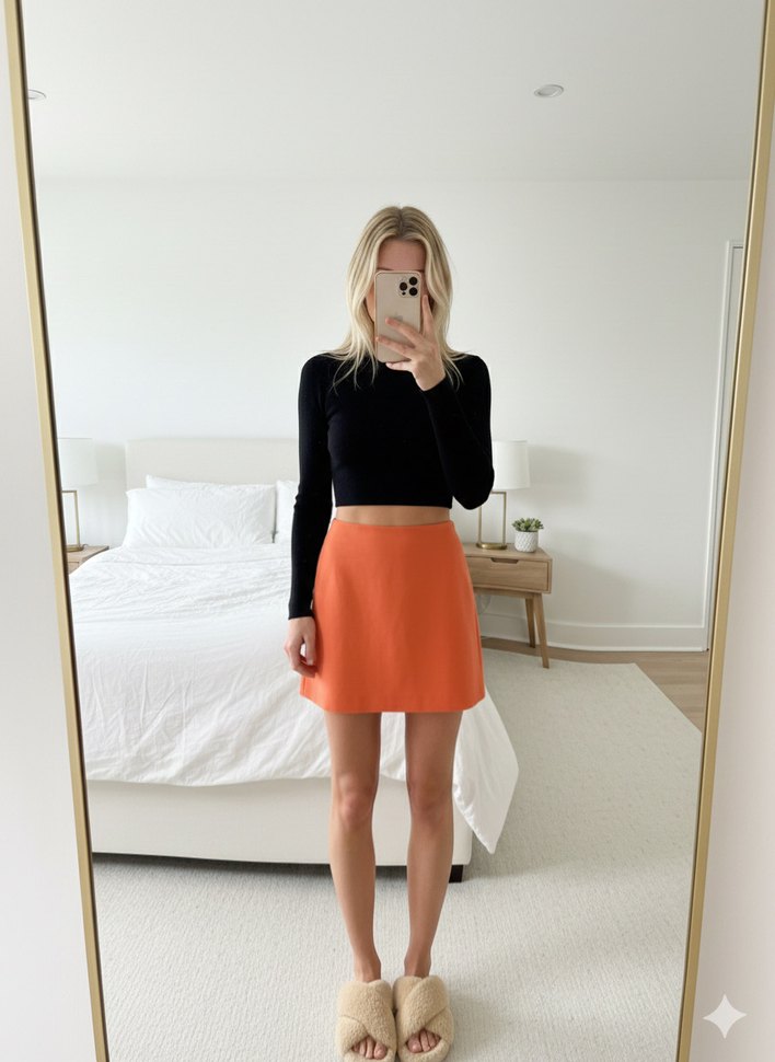 Turuncu renkte, ince ve sıcak kumaştan yapılmış, vücuda oturan midi boy mini etek. Günlük rahat stil için uygun.