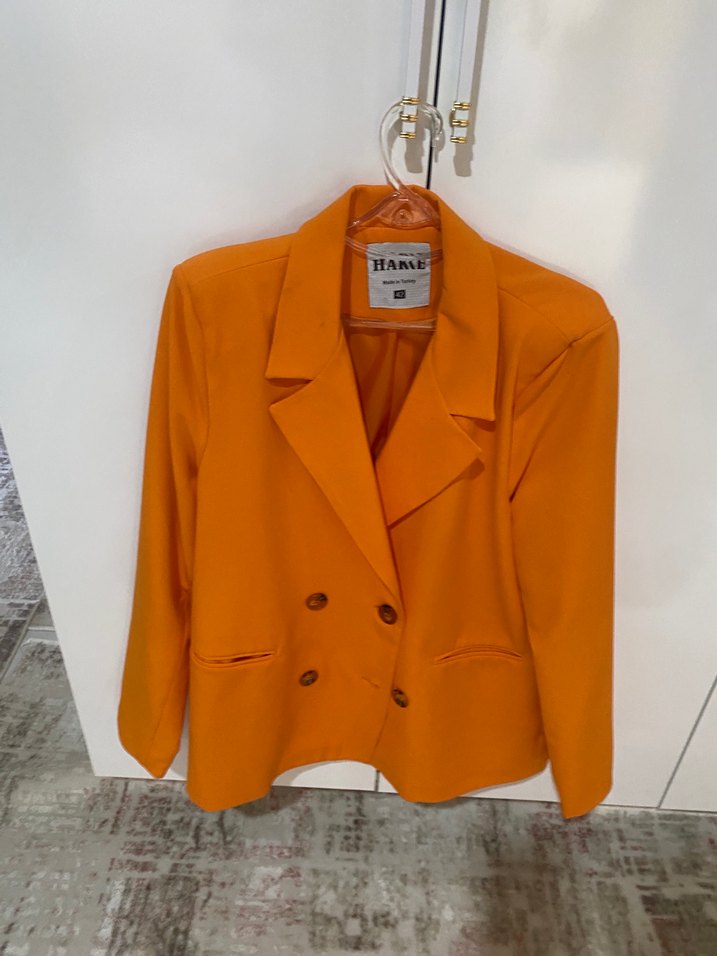 Kadın blazer ceket, kısa boy, kesilmiş yakalı ve düğmeli ön detaylıdır. İpek gibi parlak turuncu renkte, uzun kolludur ve ofis için uygun, trend sokak stiline sahiptir.