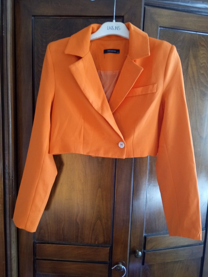 Parlak turuncu kadın blazer, yakalı, düğmeli, uzun kollu, regular fit ve kısa boyda. Ofis ve sokak tarzına uygun, sentetik kumaştan üretilmiştir.