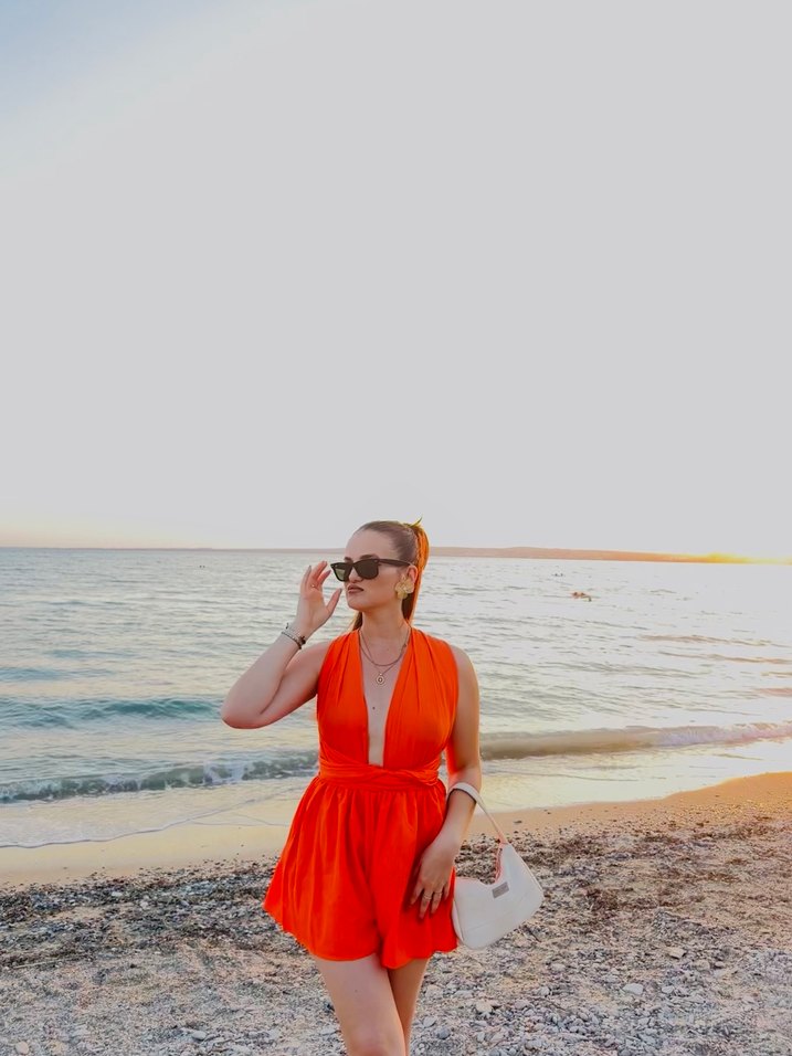 Turuncu, kolsuz ve mini boy kadın tulum, rahat kesimi ve minimal tasarımıyla plajda şıklık sunar. Bohem ve sade tarzı yansıtır. ️