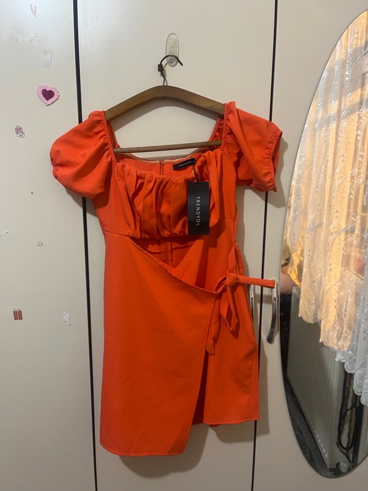 Turuncu mini elbise, kemerli ve askılı kollu, parlak sentetik kumaştan, cesur romantik akşamlar için uygun. ❤️
