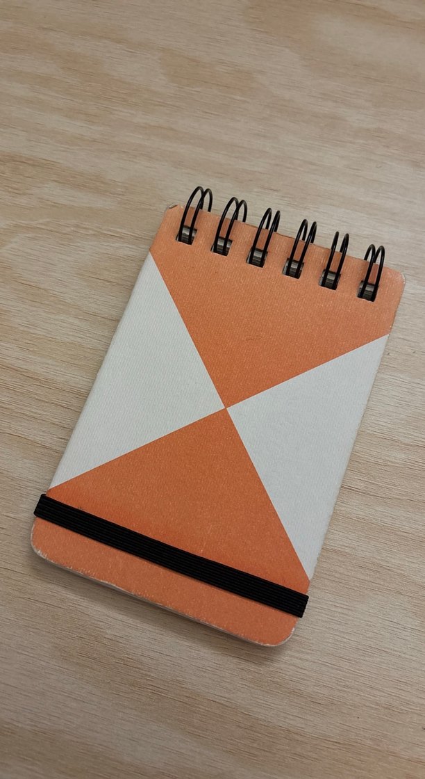 Turuncu ve beyaz geometrik kapaklı, spiral ciltli ve kapatmak için lastik bantlı küçük defter.