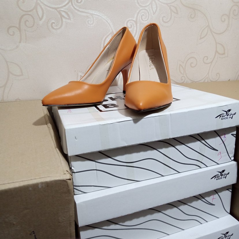 turuncuj renkli, minimalist tasarımlı, lastik malzemeden stiletto topuklu kadın ayakkabısı. Ofis kullanımı için çağdaş tarzda, zahmetsiz şıklık ve klasik zarafet sunar.