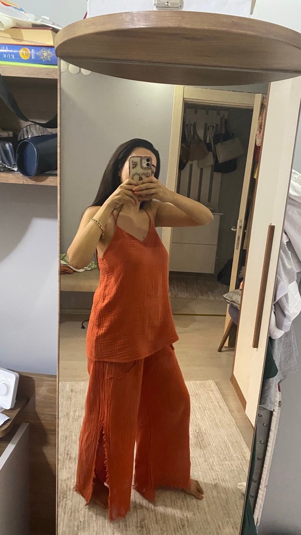 Yırtmaçlı pantolonlu muslin takım bol kesm asla terletmez,otantik.