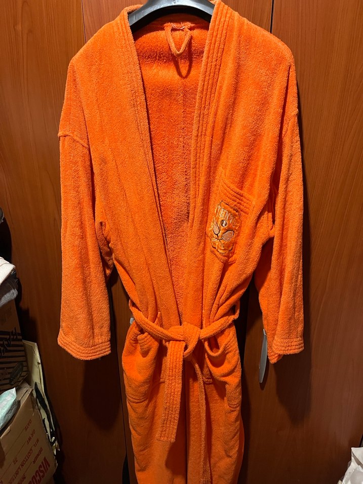Parlak turuncu renkte, nakışlı detaylara sahip yumuşak ve emici kumaştan bohem tarzında bornoz.