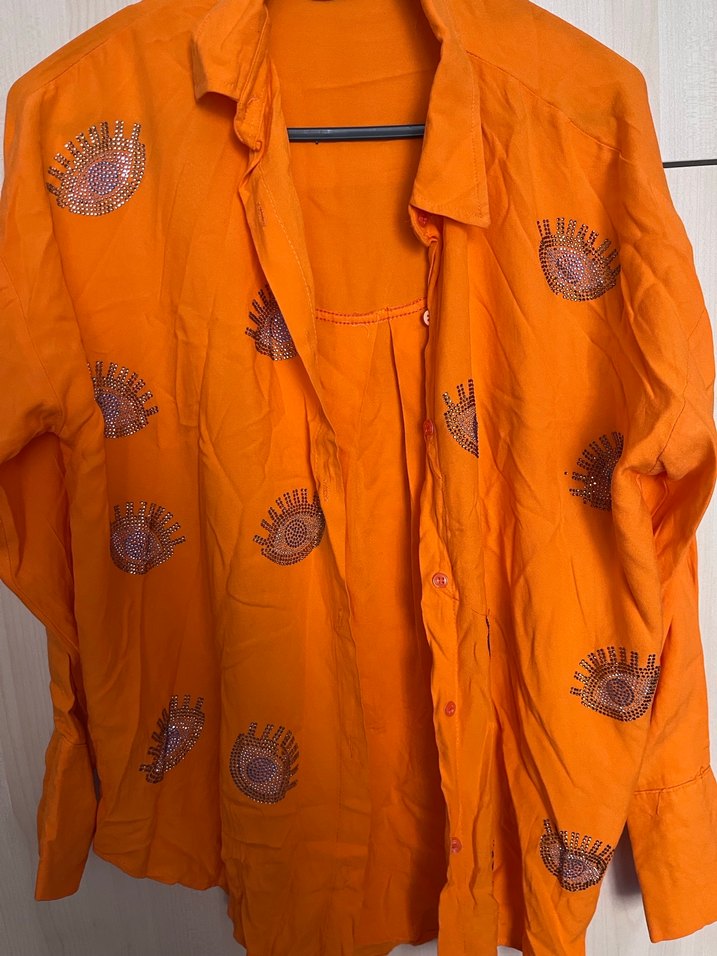 Bu bol kesim, uzun boy kadın gömleği, yakalı ve düğmeli tasarıma sahiptir. Keten kumaştan yapılmış, parlak turuncu renkte ve nakışlı desenlerle bohem tarzını yansıtır. Uzun kolludur.