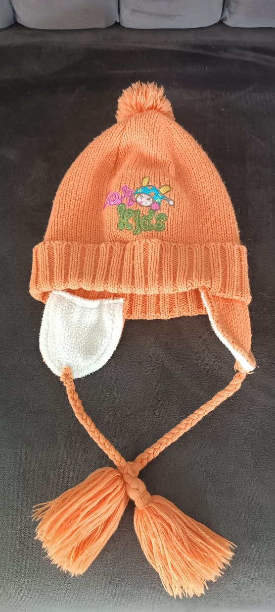 Renkli turuncu örgü bere, nakışlı desen ve örgülü püsküllü kulaklıklarla. İç kısmı yumuşak ve sıcak tutar.