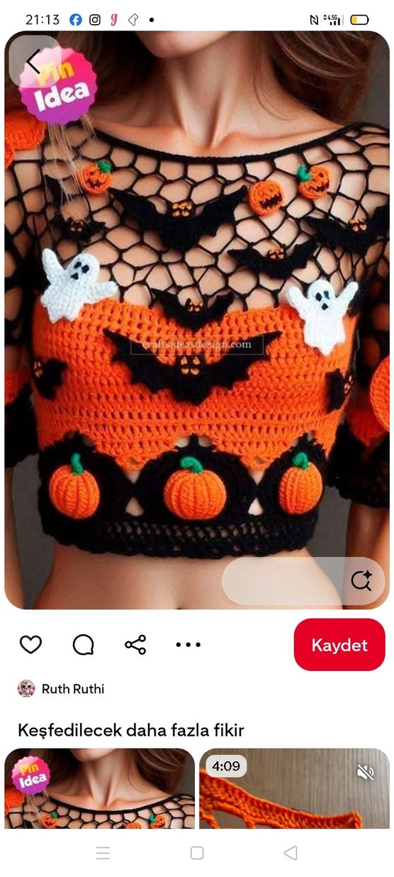 Kısa kesim, fitted örgü bustiyer, yuvarlak yakalı ve askılı kollu, turuncu-siyah nakışlı Cadılar Bayramı temalı desenlerle süslenmiştir.