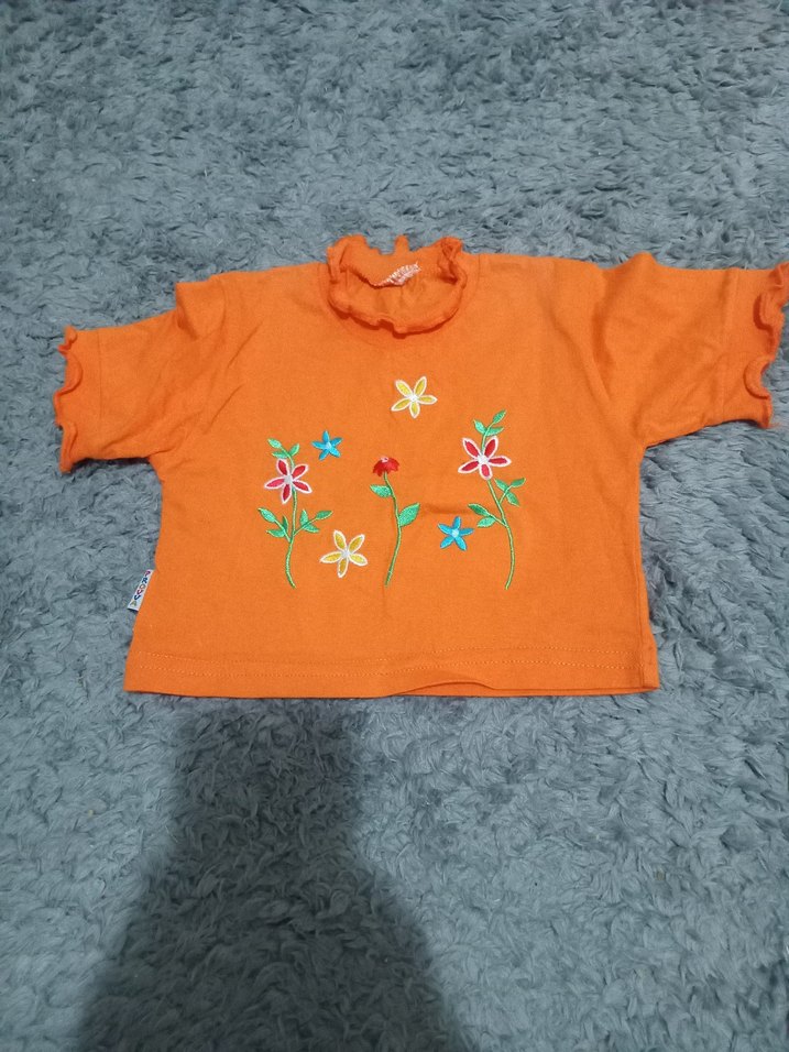 Turuncu renkli kız çocuk tişörtü, kısa kollu ve fırfırlı detaylara sahiptir. Nakışlı çiçek desenleri, bol kesim ve yuvarlak yaka ile sokak stiline uygundur.