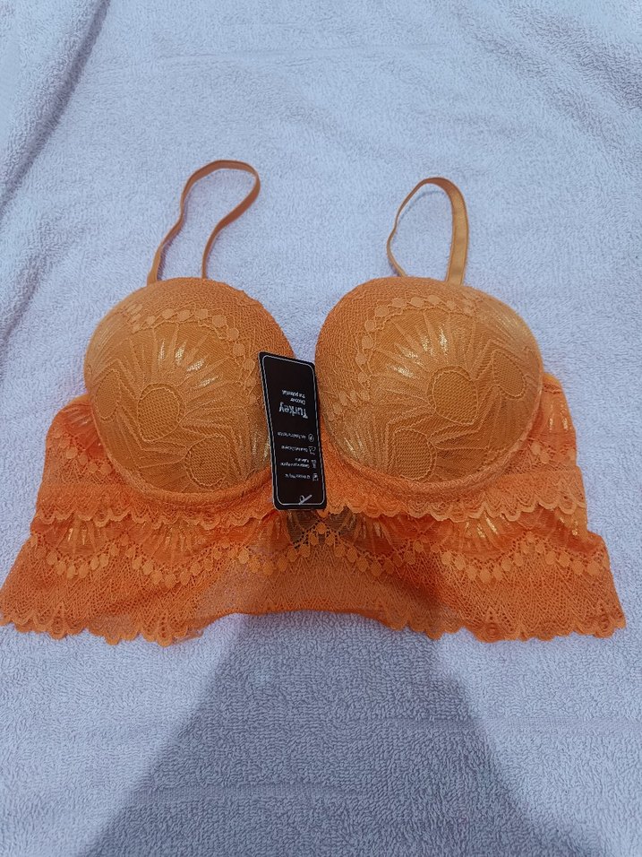 85 beden marka etikete yazıyor Parlak turuncu renkte, nakışlı desenlere sahip kısa ve mini uzunlukta bohem tarzda sütyen. Ayarlanabilir askıları ve dantel detaylı bandı vardır.