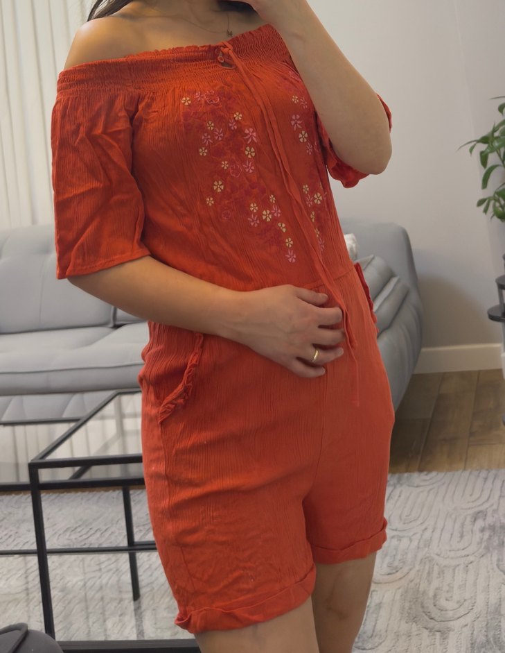 Turuncu sentetik kumaştan, nakışlı, straplez kısa kollu, günlük tulum. Bohem tarzı için uygun. Ürün çok az kullanılmıştır, hiçbir defosu yoktur.