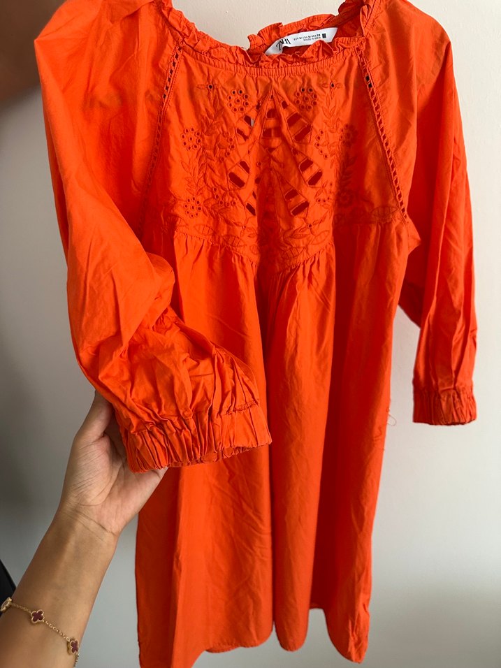 Turuncu renkli, nakış detaylı, bol kesim, uzun kollu, günlük kullanım için uygundur. Birkaç kez giyildi. Orjinal Zara.