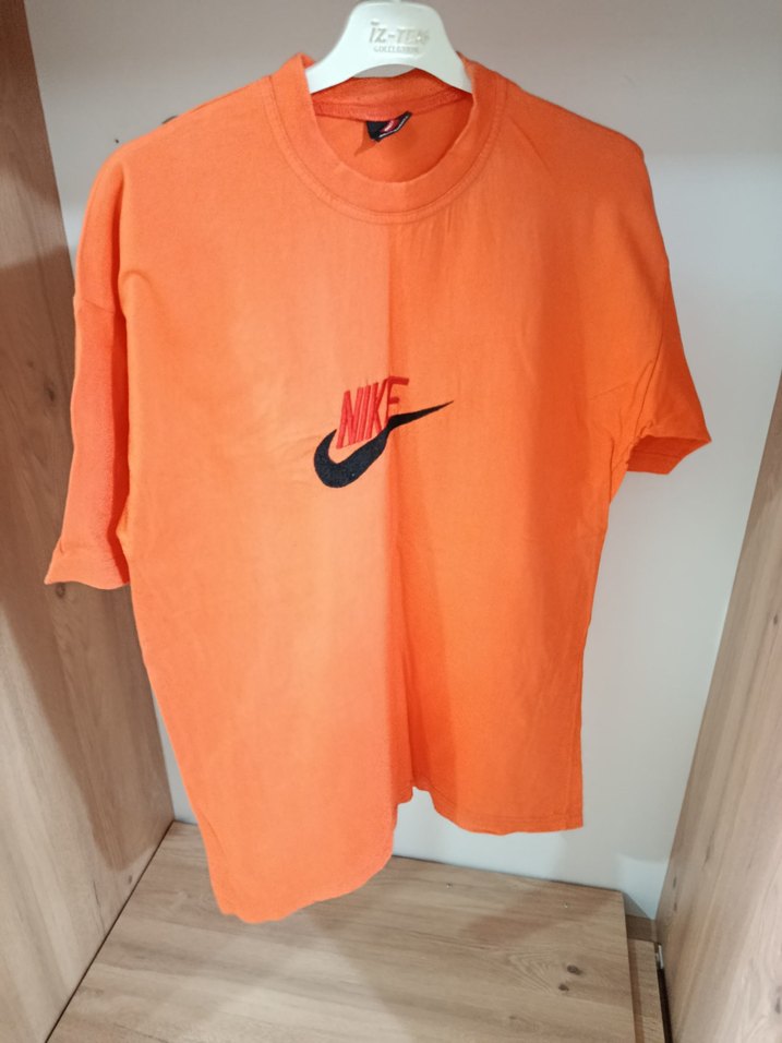 Turuncu süet kumaştan, rahat kesim ve kısa boyda, Nike baskılı erkek tişört. Sokak stiline uygun günlük kullanım için ideal.