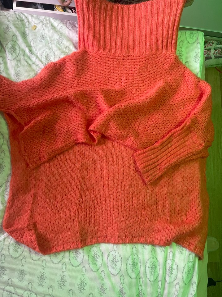 Turuncu-somon renkte, boğazlı, uzun kollu, önü kısa arkası uzun, rahat kesim örme kadın kazak.