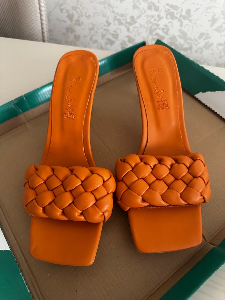 Turuncu renkli, örgü bantlı ve tokalı kadın terlikler. Kauçuk malzemeden, blok topuklu ve günlük kullanıma uygun bohem tarzda.