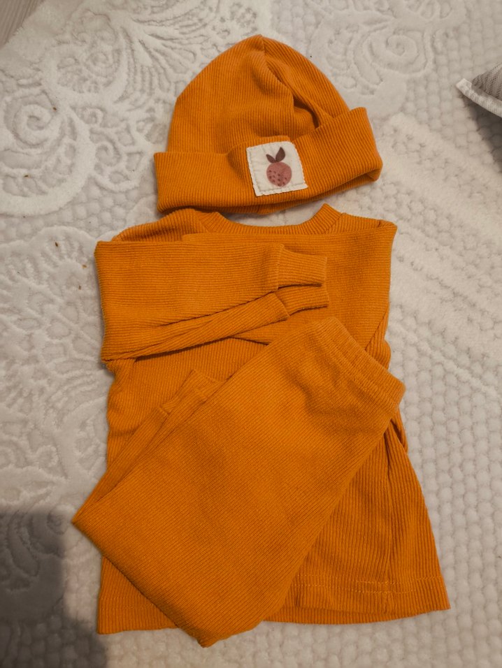 Turuncu örgü uzun kollu üst, pantolon ve üzerinde sevimli bir patch bulunan şapka içeren bebek unisex takımı.