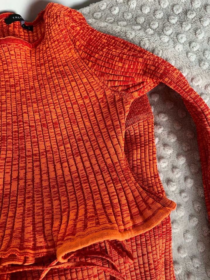 Bu turuncu kadın kazak, örgü kumaştan yapılmış, boğazlı ve uzun kolludur. Sokak stili ve günlük kullanım için uygun, rahat ve midi boyda bir tasarıma sahiptir.