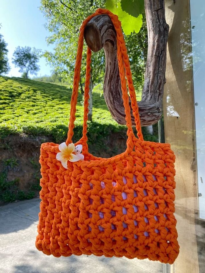 Renkli turuncu örgü bohem kadın çanta, günlük kullanıma uygun. Örgü tasarım, örme saplar ve süs olarak çiçek içerir.
