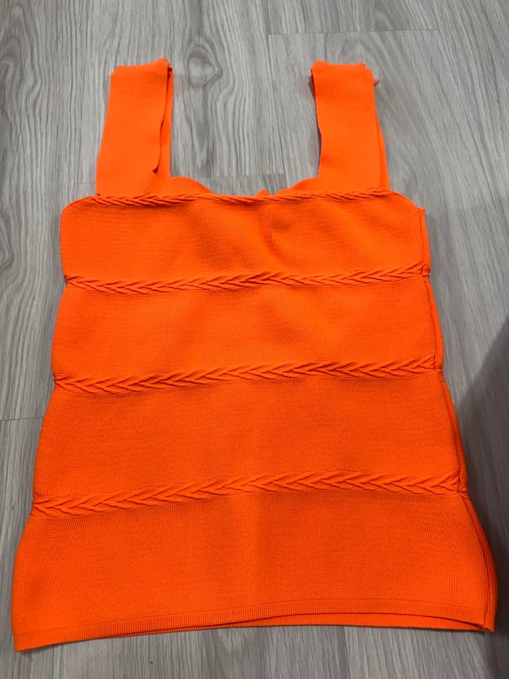 Turuncu renk, örgü detaylı, straplez kesim ve vücuda oturan kadın atlet. Sentetik kumaştan, sokak modası ve açık hava için uygun.