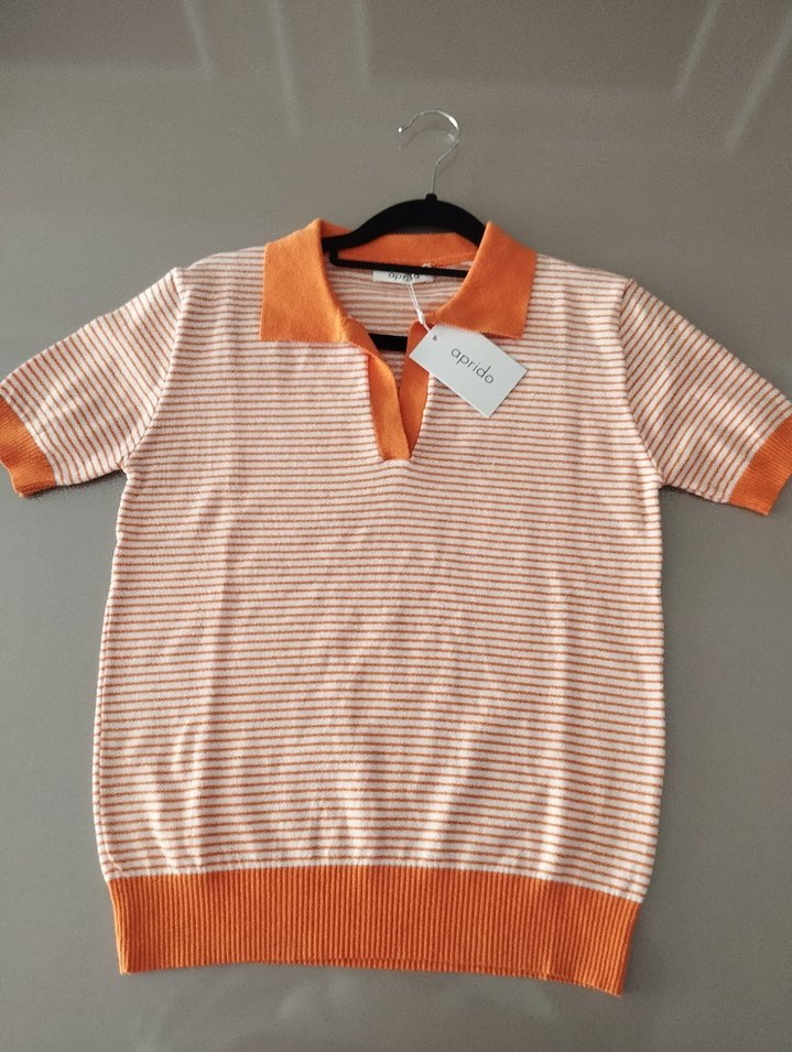 Örgü kumaştan yapılmış, kısa kollu ve yakalı erkek polo tişörtü. Gevşek kesimi ve pastel turuncu çizgili deseniyle günlük sokak stiline uygun.