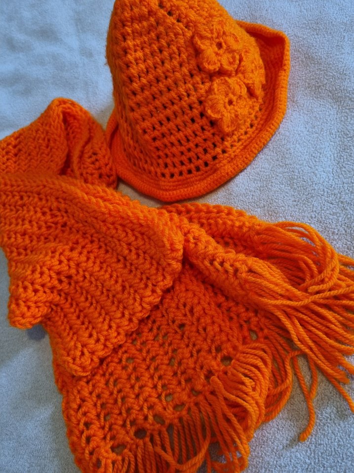 Çiçek detaylı örgü turuncu çocuk şapkası ve püsküllü atkıdan oluşan yumuşak dokulu set.