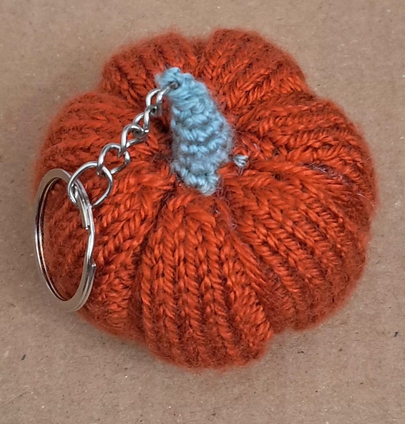 Turuncu örgü kabak şeklinde, küçük mavi saplı bohem tarzı anahtarlık. Anahtarlarınıza sıcaklık katıyor.