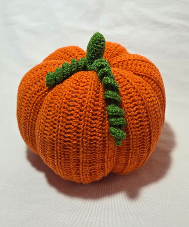 Turuncu örgü kabak şeklinde, yeşil kıvrımlı detaylara sahip yumuşak dokulu süs. Ürün el yapımıdır. Marka temsilidir.