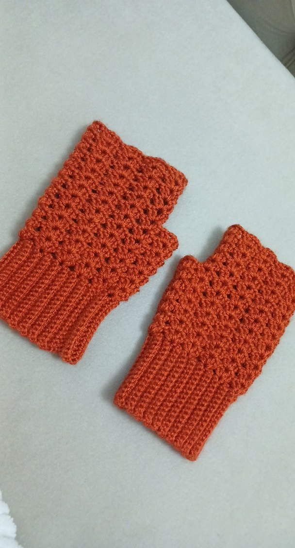 Renkli turuncu kadın eldivenleri, örgü yapıda ve rahat dokuludur. Parmaksız, sade ve temel bohem tarzda tasarlanmıştır. el yapımıdır