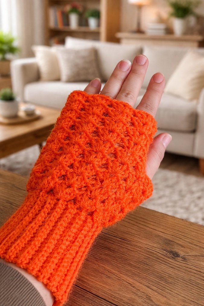 Turuncu, örgü ve parmakları açık kadın eldiveni, rahat ve renkli bohem tarzıyla öne çıkıyor. Elemeği