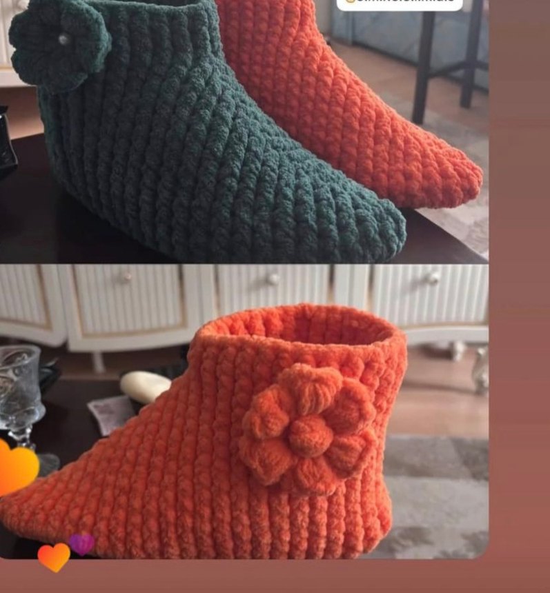 Turuncu ve yeşil renklerde, örgü dokulu, kama topuklu kadın ev terlikleri. Sade bohem tarzda, yan kısmında çiçek detaylıdır.