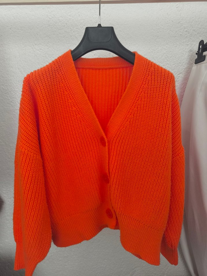 Örgü kumaştan yapılmış, uzun kollu, yuvarlak yaka, bol kesim ve kısa boyda, canlı turuncu renkli kadın hırka. Rahat ve şık sokak stili için uygundur.