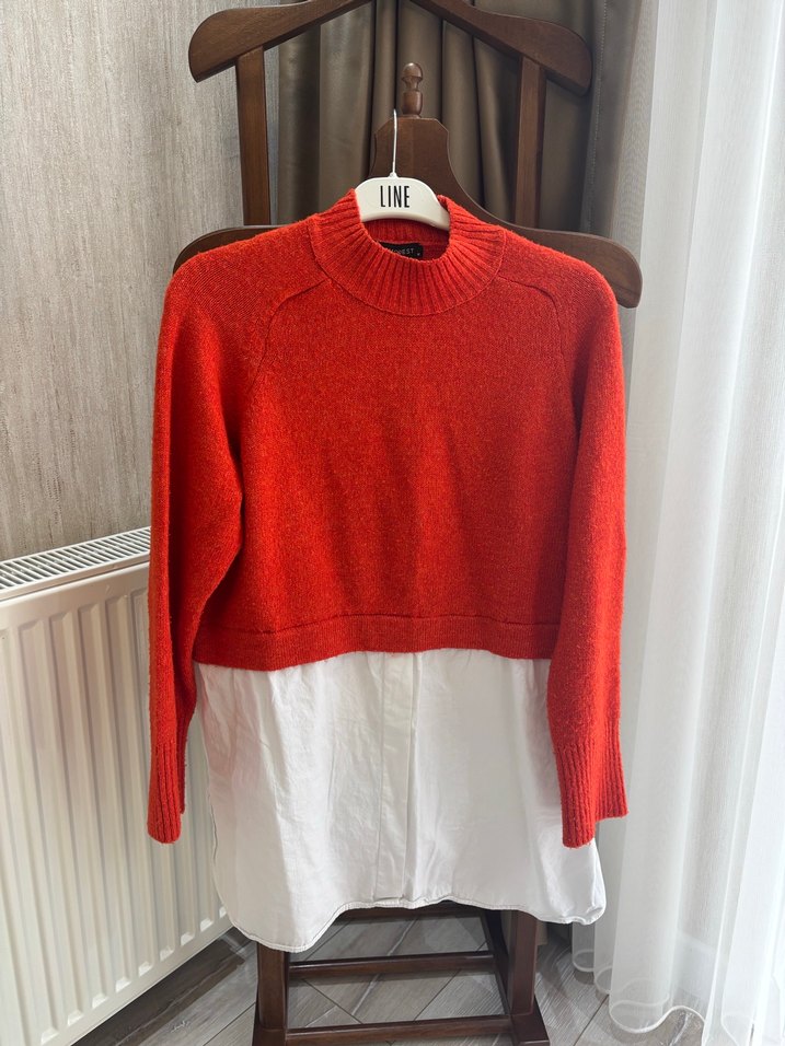 Turuncu örgü kadın kısa kazak, yuvarlak yaka ve uzun kolludur. Yumuşak yünden üretilmiş, bol kesim ve mini boydadır. Günlük kullanıma uygundur.