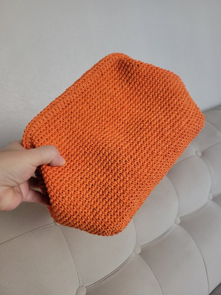 Parlak turuncu örgü dokusuyla, günlük kullanıma uygun sade ve rahat kadın portföy çantası.