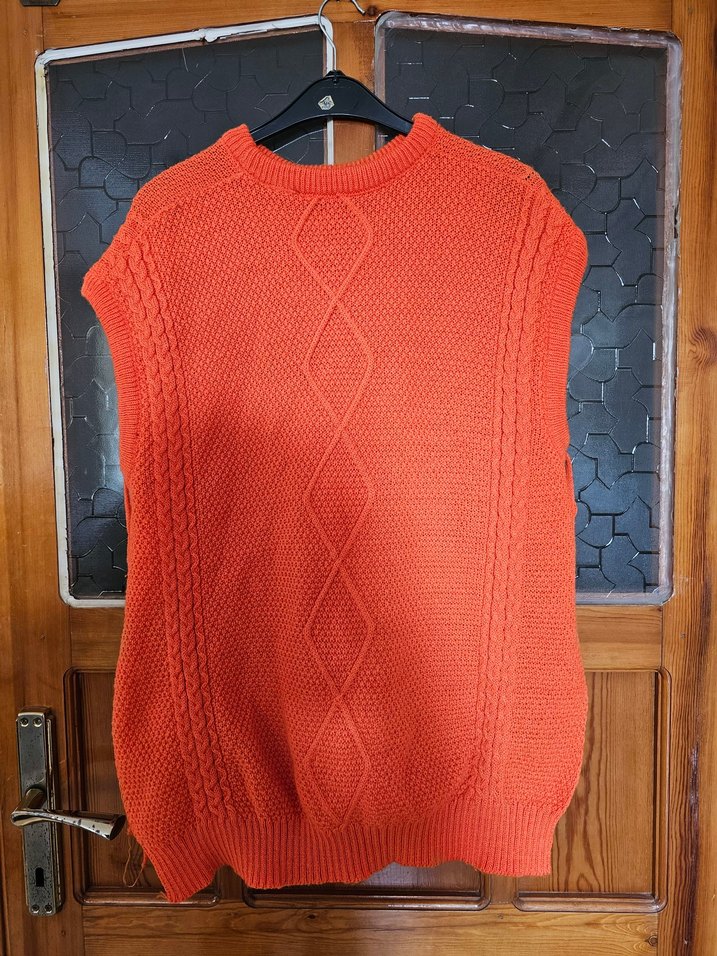 Renkli turuncu kadın süveter, gevşek kesim ve yuvarlak yakaya sahip. Yumuşak örgü kumaştan, normal midi uzunlukta ve kolsuzdur. Ön kısmında belli belirsiz bir renk farklılığı vardır. Standart kalıptır.