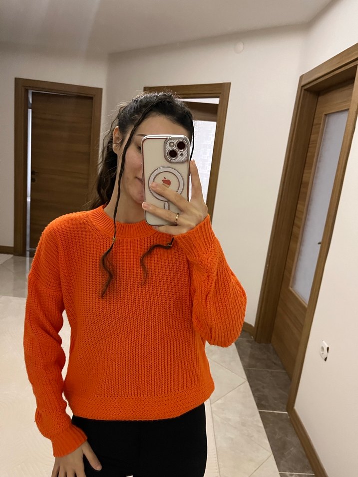 Turuncu renkli, uzun kollu ve yuvarlak yaka kadın örgü triko kazak. Rahat ve bol kesimiyle günlük sokak stiline uygundur. Midi boy ve desensizdir.