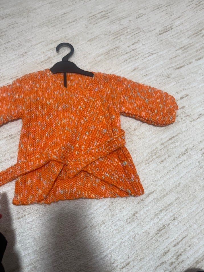 Turuncu, örgü, uzun kollu, bol kesim kız çocuk hırkası. Sokak stiline uygun, rahat ve renkli bir triko parça.