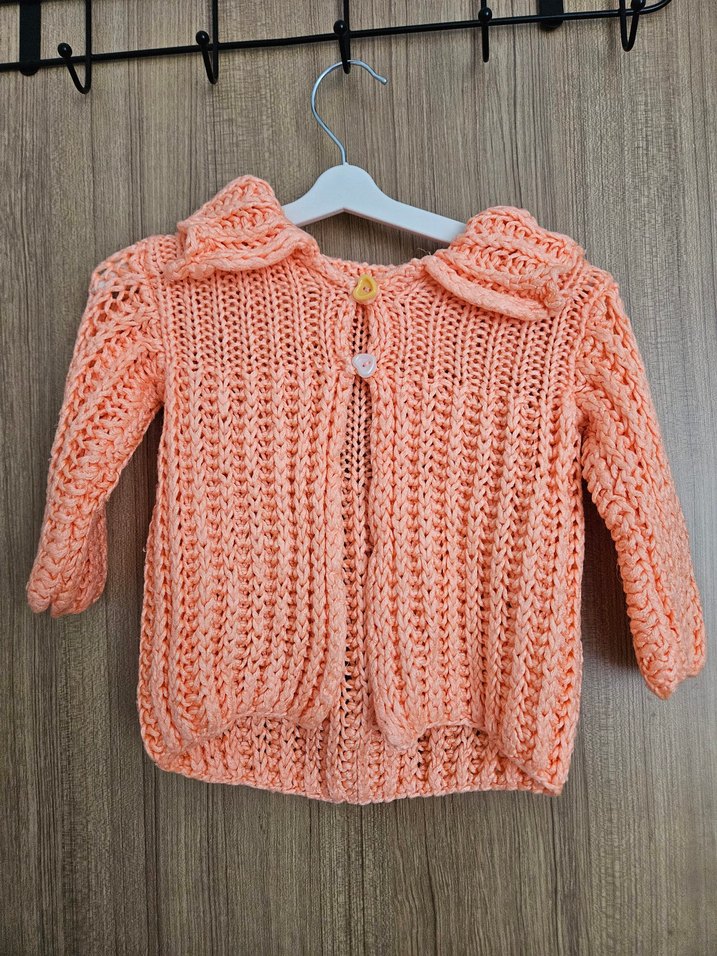 Uzun kollu, bol kesim turuncu örgü kız çocuk hırka. Yumuşak örme kumaştan yapılmış, düğmeli ve sade desensiz tasarım.